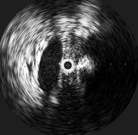 Intravascular ultrasound (IVUS) was performed, which demonstrated the presence of a severe stenosis of the left common iliac vein due to mass effect from the crossing right common iliac artery. This finding is diagnostic of a May-Thurner lesion, which was the underlying anatomic abnormality predisposing this young patient to an extensive DVT.